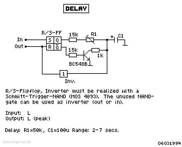Über die R-C-Kombination wird die Verzögerungszeit bestimmt. Bei einem 100uF-Kondensator und einem variablen